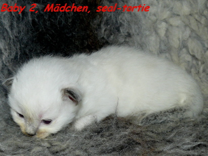 Paula ist die Halbschwester von Lacey - und sieht eigentlich schon wie eine "richtige" Ragdoll aus. Sie hat viel von ihrem Papa geerbt - auch das schmusige und aufgeschlossene Wesen! Wie ein kleiner Hund läuft sie uns überall hinterher und möchte immer dabei sein. Sie hat die Geburt ihrer Kitten wunderbar gemeistert und sie liebevoll groß gezogen - von ihr werden wir die kleine Nassana (Nessie) behalten, eine kleine seal-tortie Lady.