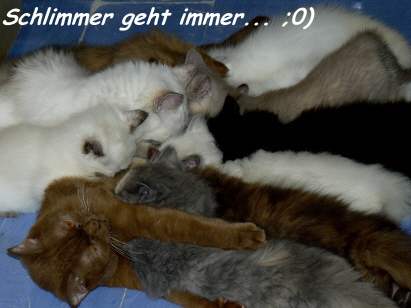 Cinnamon - eine Farbe, die ich schon immer wunderschön fand - und nach wie vor heiß und innig liebe. Als ich vor ein paar Jahren das erste Mal hörte, dass es in den USA auch Ragdolls in meiner Traumfarbe gibt, war die Sehnsucht geboren, eines Tages ein solches Tier besitzen zu dürfen. Eines Tages halt... Aber als sich dann einige Züchter in der RAG entschlossen, ein Zuchtprogramm zu beantragen, um "eigene" Cinnamon-Ragdolls zu bekommen, war ich gleich Feuer und Flamme. Mit Begeisterung bin ich dem Programm beigetreten - und inzwischen sind die ersten AON und BON-Ragdolls bei uns geboren worden. Meine "Stammkatzen" dazu sind Satinova´s Loveley Lacey, eine wunderschöne und super liebe BKH in Cinnamon, und ihre Halbschwester Satinova´s Paula Pocket, die mir beide tolle Kitten schenkten - und da sie anscheinend wussten, dass wir nun diverse Mädchen brauchen, hatten beide auch große Würfe mit mehr Mädchen als Jungs, was der Statistik absolut widerspricht... ;0)